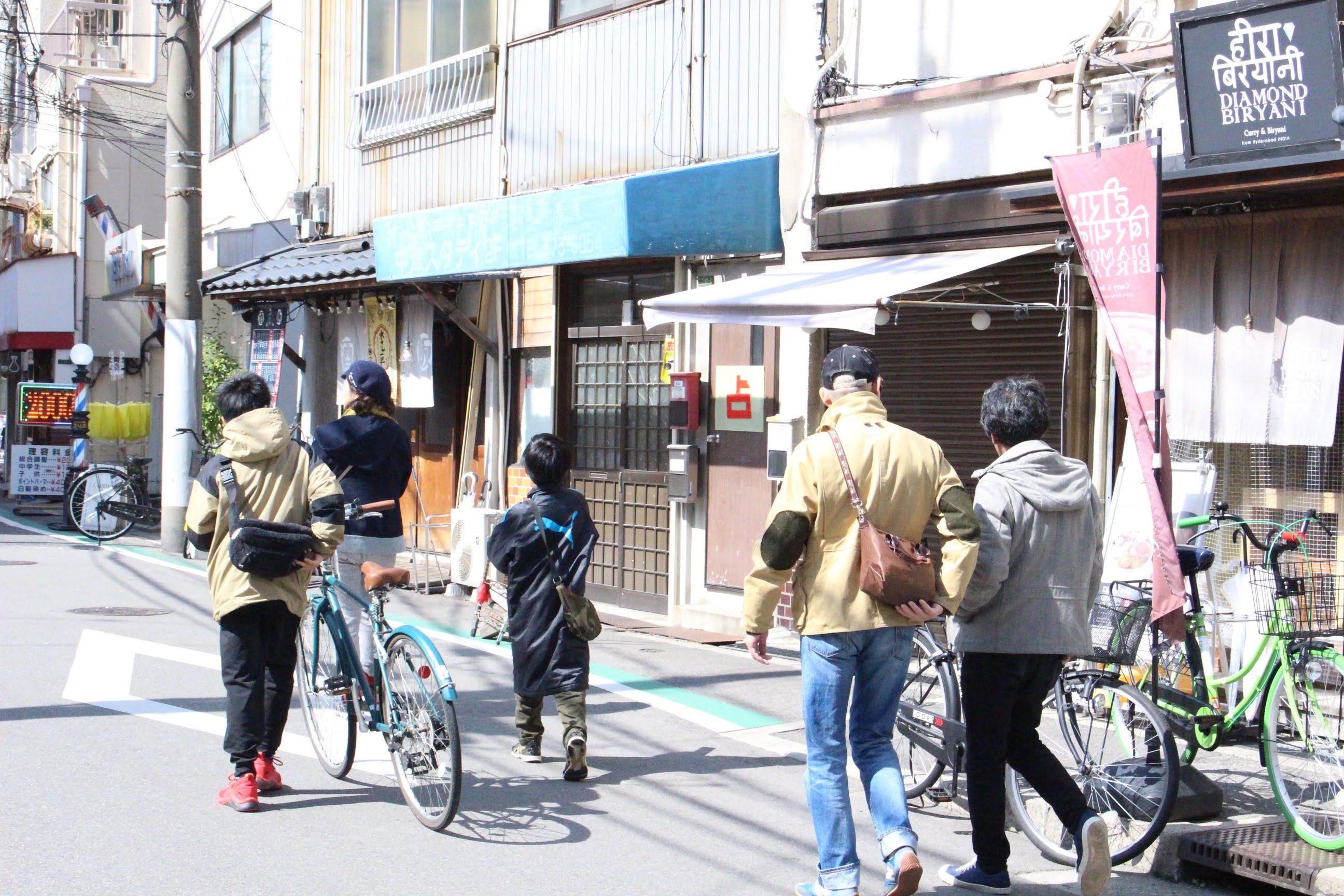 気持ちのいい晴天の中、中津商店街や周辺の路地裏、蒸気機関車のボイラーのメンテナンスも行うサッパボイラ、阪急電車の高架下など中津の独特の雰囲気を感じられる場所を見学。